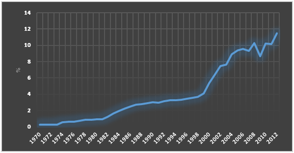 O desenvolvimento da indústria de gás natural no Brasil é um evento relativamente recente embora suficientemente longo para percebemos a falta de linearidade das políticas públicas direcionadas ao setor. Durante toda a década de 90, o consumo de gás natural nunca representou mais do que 4% da oferta interna de energia. Contudo, a partir de 1999, com o início das operações do gasoduto Bolívia-Brasil, o consumo de gás natural no Brasil cresceu a uma taxa média de 15% ao ano acompanhado pelo crescimento tanto das importações quanto da produção nacional de forma que, em 2014, o gás natural já representava cerca de 12% da matriz energética brasileira (MME, 2014).