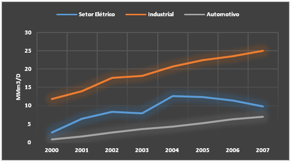 Figura 2 – Evolução do Consumo de Gás Natural entre 2000 e 2007
