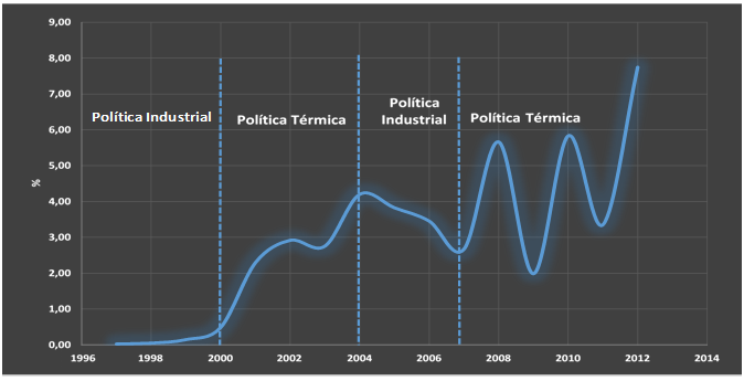 A importância do gás natural na geração elétrica manteve sua trajetória ascendente até 2004 quando atingiu 4,2% do total de geração das centrais elétricas de serviços públicos (MME, 2014). A partir de 2005, como resultado das melhores condições hidrológicas e da política de racionamento, a participação do gás natural na geração elétrica começa a se reduzir até atingir 2,6% em 2007 (MME, 2014). Sendo assim, muitos dos projetos térmicos planejados dentro do escopo do Programa Prioritário das Térmicas não saíram da prancheta. Nesse momento, definiu-se que o papel das térmicas a gás natural seria complementar atuando como back-up das centrais hidroelétricas.